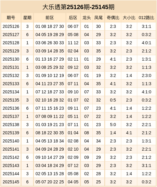 大乐透第25145开奖奖号:前区05 07 20 22 25 ;后区04 05,前区号码大小比为3:2,012路比为0:3:2,奇偶比为3:2。后区开出小小、偶奇组合。