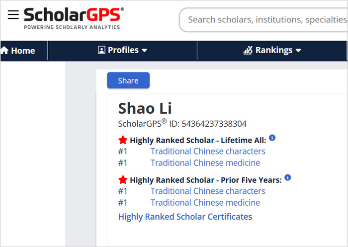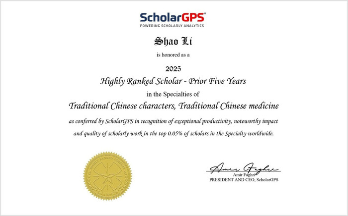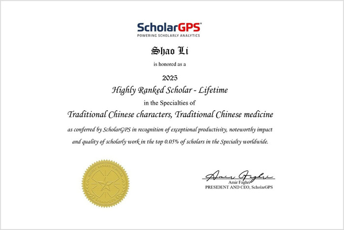 近日,国际知名学术评价机构ScholarGPS正式发布2025年全球前0.05%顶尖学者榜单。清华大学长聘教授、北京市中医药交叉研究所所长、欧洲科学与艺术院李梢院士再创佳绩,继2024年后,蝉联“TraditionalChinesecharacters”和“TraditionalChinesemedicine”两大中医药相关专业的终身(Lifetime)学术影响力榜单第一。同时在上述两个专业的近五年(PriorFiveYears)学术影响力榜单中也位列全球第一,成为中医药专业双榜双第一的学者。这一排名基于学者终身学术产出、影响力及质量等综合指标,延续了其在中医药交叉研究领域的国际引领地位。