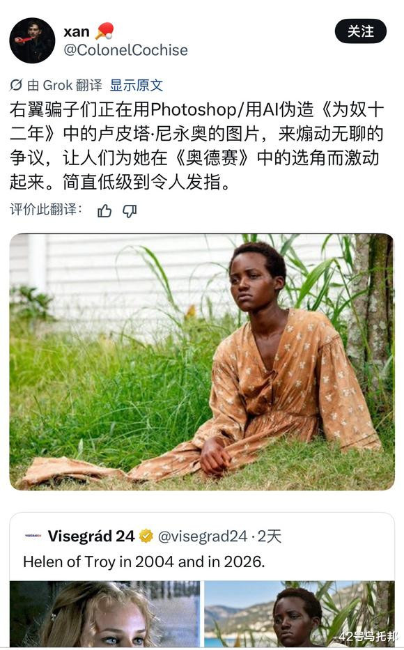 先说结论,右翼分子疯传的所谓露皮塔饰演海伦的照片是ai的。消息源来自推特账号Visegrad,是露皮塔在《为奴十二年》中剧照的ai处理,不管是马斯克还是很多网友都没看出来。